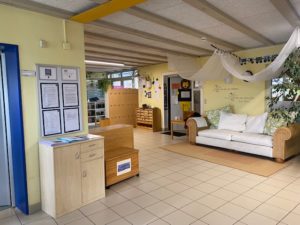 Die Turnhalle und der Therapieraum werden übergreifend von allen Gruppen genutzt. Der weitläufige Flurbereich bietet als Begegnungsstätte zudem einen großzügigen Spielbereich für alle Kinder.