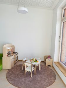 Unsere Räumlichkeiten und einzelne Spielbereiche sind so eingerichtet, dass die kindlichen Bedürfnisse erfüllt werden und sie sich wohl fühlen.  In unserem Garten finden sich viele heimische Bäume und Sträucher wieder, sowie Hochbeete mit Kräutern und Beerensträucher. Einzelne Spielgeräte und -materialien sowie der Sandkasten und der kleine Rutschberg laden unsere Kinder zum kreativen Spiel im Freien ein.