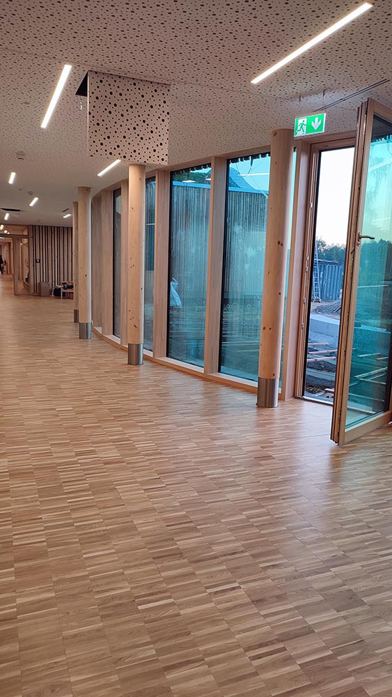 Das Gebäude zeichnet sich durch hohe lichtdurchflutende Räume mit großen Fensterfronten aus.
