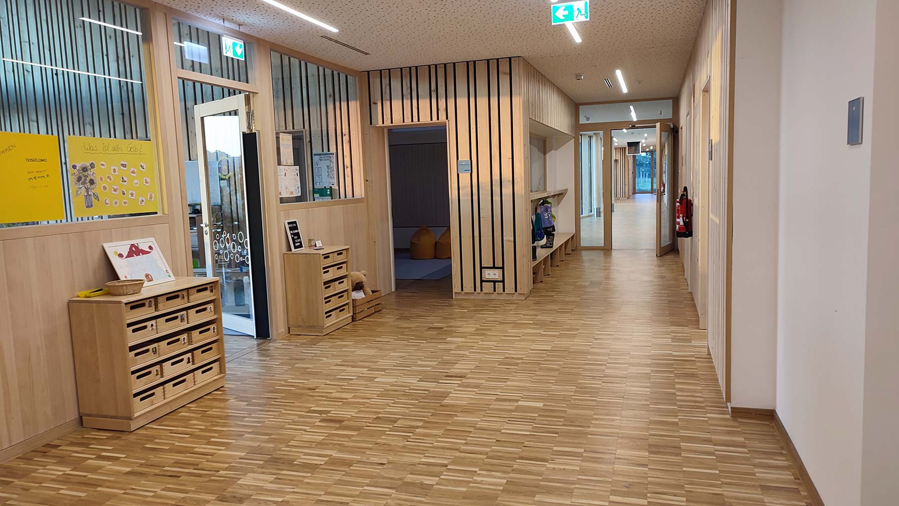 Gruppenübergreifend stehen fünf Lernwerkstätten für individuelle Angebote sowie eine Holzwerkstatt im Garten zur Verfügung. Die gesamte Einrichtung nutzt den Turnraum für individuelle Bewegungsangebote.