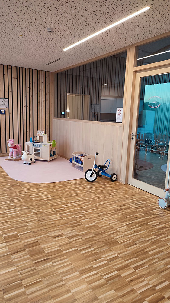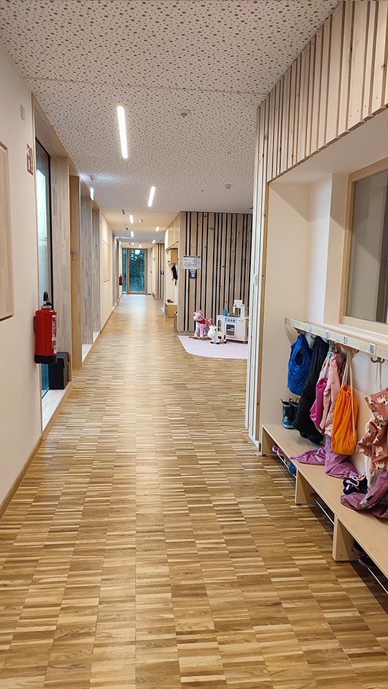 Die Kinderkrippe verfügt über zwei Gruppenräume und je einem Ruheraum, einem gemeinsamen Bad- und Wickelbereich, einer Schmutzschleuse in den Garten, sowie einem großzügigen Spielegang. Im Kindergarten verfügt jede der drei Gruppen über einen Nebenraum. Es gibt zwei Bäder und zwei Schmutzschleusen, die in den Garten führen.